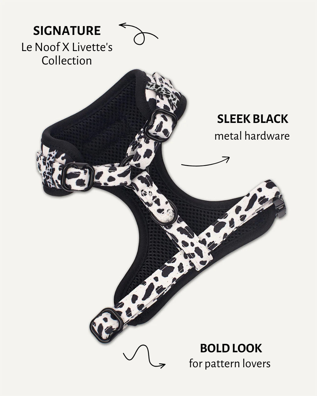Yes. Every print in the Le Noof X Livettes Wallpaper collection — cow print, modern geometric, beige herringbone, and brown checkered — is available across harnesses, collars, leashes, poop bag holders, dog seat belts, and treat pouches. Build a complete matching set or mix prints for a custom look.
