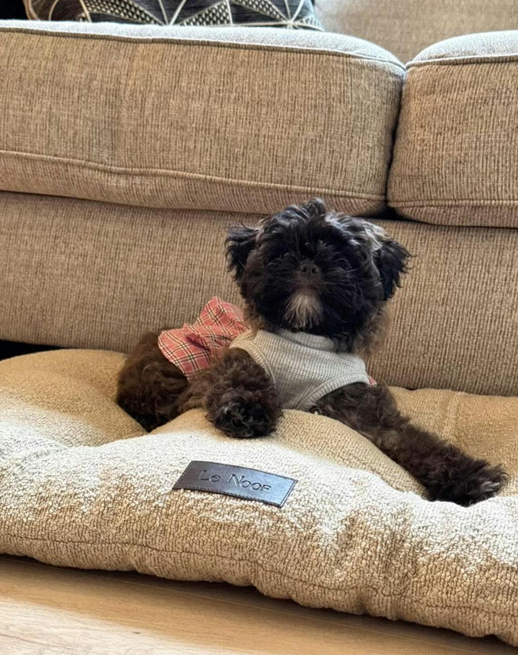 A soft flannel dog bed with orthopedic matress for joint support and restful sleep. Features a removable pillow, waterproof lining, and machine-washable cover. Designed for comfort, durability, and a cozy, minimal look. Beds arrive rolled and vacuum-packed — please allow up to 72 hours to fully expand to their intended shape.